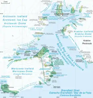 Admiralty Bay is an irregular bay, 8 km (5 mi) wide at its entrance between Demay Point and Martins Head, indenting the southern coast of King George Island for 16 km (10 mi), in the South Shetland Islands of Antarctica. The name appears on a map of 1822 by Captain George Powell, a British sailor, and is now established in international usage. The Henryk Arctowski Polish Antarctic Station is situated on the bay, as is the Comandante Ferraz Brazilian Antarctic Base. It has been designated an Antarctic Specially Managed Area (ASMA 1).