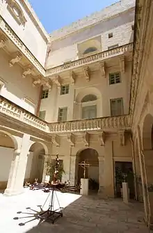 The building has a monumental free-standing staircase, which is said to be one of the finest in Malta.[8][10][17] It might have been influenced by the staircases at Auberge de Castille in Valletta, Würzburg Residence in Bavaria and Palais Kinsky and the Upper Belvedere in Vienna.[21]