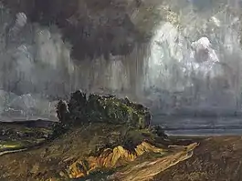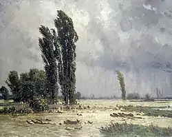 Later, he visited Dresden, Milan and Paris, where he came into contact with French landscape painting at the Exposition Universelle (1867) and visited the artists' colony at Barbizon. After his father's death, he settled permanently in Munich; becoming part of a circle of Swiss artists that included Arnold Böcklin and Otto Frölicher as well as the art historian, Adolf Bayersdorfer. In 1882, he made a lengthy visit to Italy. He generally made sketches en plein aire during the summer and turned them into paintings at his studio in the winter. One of his best known works "Rising Thunderstorm" was painted on commission by the government of Aargau and may be seen at the Aargauer Kunsthaus.