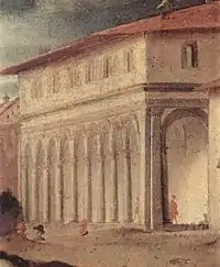 It was commissioned to be inserted into the room's wooden paneling, alongside works by other artists, in the manner of the slightly earlier Marriage Chamber in Florence's Palazzo Borgherini, to which Pontormo also contributed. The other works in the antechamber were Franciabigio's Bathsheba Bathing (Gemäldegalerie, Dresden) and Bacchiacca's Legend of the Dead King's Son (Gemäldegalerie, Dresden) and Baptism of Christ (Gemäldegalerie, Berlin), all surmounted by a larger work, Andrea del Sarto's Saint John the Baptist as a Boy (Galleria Palatina, Florence).[2]