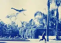 Republic's flying effects, under the direction of Howard and Theodore Lydecker, were performed using a dummy that was slightly larger than life (at 7 feet tall) and made of paper mâché so that it weighed only 15 lbs. The uniform was made of thin silk and cotton jersey.[9] Four pulleys were connected to each shoulder and leg calf, which were then strung on two wires so the dummy moved along them by its own weight. The wires were attached to two opposite objects running across the camera's field of view, and the dummy then slid from one to the other, giving the illusion of flight. This system was originally intended for use in their Superman serial; a prototype dummy was even built but later discarded.[9] The flying pose used for the dummy (arms outstretched and back arched) was based upon a Captain Marvel drawing by comics artist Mac Raboy.[9] If the dummy needed to be seen flying upwards, the cape was convincingly weighted and the dummy was then slid backwards. The film sequence was then optically printed in reverse, completing the flying illusion.[9]