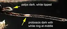 Ae. taeniorhynchus adults are mostly black with areas of white banding. A single white band appears at the center of the proboscis, multiple white bands span the distal ends of the legs following the leg joints, and the last hind leg joints are completely colored white.[11] Ae. taeniorhynchus wings are long and narrow with scaled wing veins.[13] Experimental investigation of evolutionary coloration of Ae. taeniorhynchus yielded negative results.[14] Mosquitoes reared in conditions of darkness, backgrounds colored black, white, or green, and lighting conditions of fluorescent light or sunlight, showed no color changes in the fat body nor in the head capsule, saddle, or siphon.[14] This lack of cryptic coloring is suggested to be due to a lack of threat to the species; because the species habitat is a temporary water source used for larval growth, this temporary environment has few predators and relatively little danger.[14]