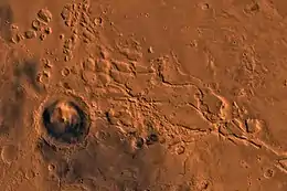 There are multiple competing theories about the origin of the fretted terrain. One hypothesis states that it was formed during the late Noachian period of Mars' development, via wind erosion.[19] However, more recent studies favor an explanation in which Hesperian-aged glaciers, 1.5 to 2.5 kilometres (0.93 to 1.55 mi) in height, were the cause of this terrain. The shape of the valleys of Aeolis Mensae support the latter hypothesis; they tend to be u-shaped rather than v-shaped,[16] which indicates a period of glaciation in the past.[20] U-shaped valleys may also be explained by sapping,[21] although this would not explain other (glacier-indicating) features such as the system of concentric lobate ridges and the presence of cirques.[16] Aeolis Mensae lack the lineated valley fill and lobate debris apron features, features present at many other fretted terrains.[22] The presence of these features would indicate a Late Amazonian glacial origin.[23][24] A fluvial origin of the valleys is unlikely, due to the low number of tributaries among other factors.[16][25]