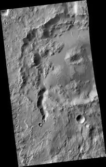 It was named in 1976,[6] and examined in detail by Mars Express's HRSC camera in 2007.[1] The Curiosity rover landed in the neighboring Gale Crater in 2012,[7] and since then the area has received limited but continued attention from both ESA's HRSC and NASA's HiRISE cameras in orbit.[8] In 2019, it was determined that Curiosity had detected methane originating from this region.[4]