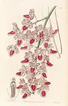 Aerides maculosa is a species of orchid endemic to India.[2] The epithet "maculosa" means "spotted," in reference to the colored spots on the tepals.[3]