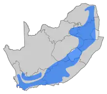 Range across South Africa, Lesotho and Eswatini (also in eastern Zimbabwe)