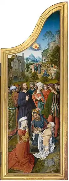 The person who commissioned the work was Adolph of Cleves, Lord of Ravenstein, a powerful individual connected to the rulers of Burgundy. He is depicted in the front and middle of the left panel entitled The Marriage at Cana.[17] The triptych depicts on the left wing Christ's first miracle at the wedding of Cana and ends with the last miracle of Christ, the raising of Lazarus, which is depicted on the right wing attributed to van den Bossche. The central panel depicts the miracle of the multiplication of the loaves.[16]