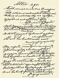 Early in the morning on 21 November the patient suddenly sent for champagne. His wife protested, but Fet seemed to be in great agitation and haste. "Go and return as quickly as you can," he ordered. As Maria left, Fet told his secretary (referred to later as Mrs. F.): "Come with me, I will dictate to you". – "A letter?" she enquired. "No", came the reply. Mrs. F. followed him and wrote the following: "I see no reason for consciously prolonging my suffering. I willingly chose to do what would be inevitable anyway." He signed this: "21 November. Fet (Shenshin)", with a "firm hand, certainly not that of a dying man," according to the biographer Boris Sadovskoy.[22] What followed was "a kind of mental storm some people experience when facing death. Only a bout of temporary madness could account for his starting running about, fetching dinner and paper knives which obviously could do him no serious harm," Sadovskoy wrote. As Fet grabbed a paper knife from the table before him, Mrs. F. managed to disarm him, injuring her hand. Chased by his bleeding secretary, Fet entered a dining-room, approached the cabinet where table-knives were kept and unsuccessfully tried to open it. Then, panting, he suddenly fell on a chair. According to the secretary, his eyes opened wide, as if facing some terrible sight, his hand rose as if to make a cross, then fell down lifeless. The cause of his death was later maintained to be heart attack. The funeral service was held on 22 November 1892, at the Moscow University church. Afanasy Fet was interred on 23 November in his family vault in Kleymyonovo, the old Shenshin family estate.[4][22]
