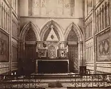 The foundation stone of the church was laid on 4 December 1847 by Sir George Russell Clerk, Governor. When Conybeare stood down as town engineer in 1850, Captain C.W. Tremenheere of the Royal Engineers took on the role of superintending architect modifying certain aspects of the approved design such as reducing the pitch of the roof and height of the tower. Architect William Butterfield in conjunction with students from the Sir Jamsetjee Jeejeebhoy School of Art designed the decorative tile reredos. The Afghan War Memorial mosaics, the polychrome floor tiles, choir stalls, screen and pews were also produced to Butterfield's designs.[8] The church was consecrated on 7 January 1858, by Bishop of Bombay, John Harding. The spire cost a sum of Rs 5,65,000 and was finished on 10 June 1865. Sir Cowasji Jehangir contributed a sum of Rs 7,500 to help complete the building.
