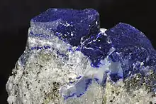 Afghanite, (Na,K)22Ca10[Si24Al24O96](SO4)6Cl6,[2] is a hydrous sodium, calcium, potassium, sulfate, chloride, carbonate alumino-silicate mineral. Afghanite is a feldspathoid of the cancrinite group and typically occurs with sodalite group minerals. It forms blue to colorless, typically massive crystals in the trigonal crystal system. The lowering of the symmetry from typical (for cancrinite group) hexagonal one is due to ordering of Si and Al.[2] It has a Mohs hardness of 5.5 to 6 and a specific gravity of 2.55 to 2.65. It has refractive index values of nω=1.523 and nε=1.529. It has one direction of perfect cleavage and exhibits conchoidal fracture.[4] It fluoresces a bright orange.