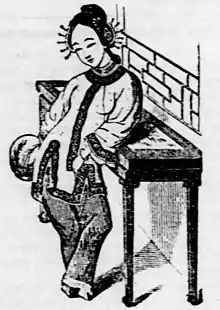 Afong Moy was the first known female Chinese immigrant to the United States.[6][7] In 1834, Moy was brought from her hometown of Guangzhou to New York City by traders Nathaniel and Frederick Carne, and exhibited as "The Chinese Lady". Announcements of her exhibitions advertised her clothing, her language, and her four-inch "little feet",[8] a result of foot binding.
