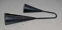 Whilst respecting and honouring the African and African-Bahian religious Carnival heritage, the careful selection of certain instruments greatly affects and impacts the percussive culture as well as an individual's relationship with the spiritual realm.[3] The music of Candomblé uses the atabaque drums, the agogô bell and the afoxés (also refers to the small beaded gourds used by the afoxé groups), which all play central roles in afoxé Carnival traditions.[1][3][17] An atabaque is the name given to a conga-like drum, which is closely associated with African heritage.[1][5] These single-headed drums are made from wood and animal skins. Traditionally, in the Afro- Brazilian religious setting of Candomblé, these drums come in three sizes; Rum (large), Rumpi (medium), and Lê (small).[1] In the afoxé, the lead drummer will use the largest size drum (Rum) and will improvise variations of set patterns, which are coordinated with dance movements.[1] The agogô bell refers to a metal bell, deriving from Central and West African musical cultures.[3] The bell's role is to provide a syncopated rhythm in afoxé performances.[1][5] The afoxé gourd shaker is a percussion instrument deriving from West Africa. The instrument contains the gourd (cabaça), which is wrapped in a net with threaded beads and plastic balls. With these instruments, traditional songs deriving from the Candomblé religion are played and sung during afoxé Carnival.[5][17]