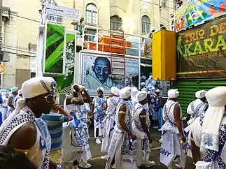 Filhos De Gandhi is the most acknowledged afoxé group, as it is considered the largest, oldest and most respected Carnival group in Salvador, Brazil.[2][18] The exclusively all-male group, Filhos De Gandhi meaning Sons of Gandhi, was founded in the year 1949, the year following the assassination of the well-respected Indian leader, Mahatma Gandhi.[19] The creation of this afoxé group was inspired by Gandhi's death, who was an advocate for racial injustice in India. The anti-violence and civil rights activist was transformed into a sacred Carnival icon. As a result, a group of stevedores originating from the Port of Salvador were inspired to form this Carnival group, with the intent of being symbols of peace whilst combating discrimination against Afro-Brazilian peoples in the city of Salvador.[1][2][18] Local priests of the Candomblé religion also participated in this afoxé group.[1] Women were not allowed to participate. Due to the fact that the group was formed by stevedores, there was an absence of women working and unloading the ships.[18] Women could only offer "logistical support, by taking care of the men's costumes and beautifying their turbans".[18]