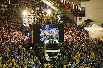 Between the years 1905 and 1914, Carnival expressions that included African music, dancing and costumes were banned and forced out of the city's official Carnival by Bahian police.[1] The Afro-bahian practice of Candomblé was recognised as violent and individuals following the religion were subjected to legal prohibitions and police action.[1] This caused these large, organised African groups to separate.[1][9] Afoxés continued their traditions in the poor neighbourhoods of the city.[1][10][11] On February 5, 1921, mentions of 'African' Carnival practices were reintroduced, appearing in the Bahian newspaper, Diário de Notícias.[1]