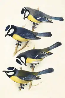 The African blue tit (Cyanistes teneriffae) is a species of bird in the family Paridae. It is found in northern Africa and the Canary Islands. Its natural habitat is temperate forests. This species and the Eurasian blue tit were formerly considered conspecific. The status of this species has not been assessed because it is noted to be common on the islands of Tenerife and Gran Canaria. The species has been used in many research studies due to its island populations and relevance to evolutionary hypotheses.[2]