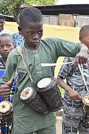 Batá drums have an hourglass shape with a drumhead at either end.[20] Traditionally, a batá drum would consist of a wooden base with drumheads made of skin, pulled taut, at each end.[20]Batá drums are available in a variety of sizes, each with a different purpose in creating overall rhythm and sound.[20] Sound is produced by the individual striking the drumheads on each side with their hands.[20] This particular variety of drum originated in Nigeria among the Yoruba people and was once an instrument used for religious purposes to worship the African Orishas.[20] The batá drums are now widely used in Latin American and afro-Caribbean music.[21]