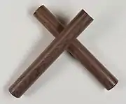Claves (also called palitos) consist of two short, round pieces of wood which are struck together to produce sound.[18] Modern day claves originated in Cuba[18] and are reminiscent of early percussive instruments present in ancient, indigenous civilisations all around the world, including Africa and South America.[24][18] Claves are used to maintain a rhythm known as the ‘clave’, or the key.[25]