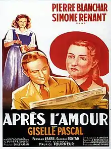 After Love (French: Après l'amour) is a 1948 French drama film directed by Maurice Tourneur and starring Pierre Blanchar, Simone Renant and Giselle Pascal.[1] The film is based on the 1924 play of the same title by Henri Duvernois and Pierre Wolff which has been adapted for the screen a number of times. Tourneur shot it in five weeks and came in under budget.[2] It was the director's penultimate film, followed by Dilemma of Two Angels the same year.