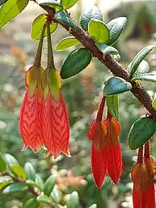 Agapetes serpens is a semi-climbing shrub species native to the Himalayas, 40–60 cm tall, grown as an ornamental for its attractive pendulous benches of red tubular flowers blooming over a long period. It is mostly grown in climates from cool temperate to sub-tropical. Propagation is from cuttings.