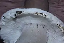 The gills are initially pale pinkish to pinkish-gray before becoming brown, then chocolate-brown or darker when the spores mature. In maturity, the gills are free from attachment to the stipe, and are packed close together with little intervening spaced between them. The stipe is 7–20 cm (2+3⁄4–7+7⁄8 in) long, and 1–3 cm (1⁄2–1+1⁄4 in) thick but with a thicker or bulbous base.[8] Firm, smooth, and lacking the scales found on the cap, the stipe is white but discolors dingy pinkish or brownish in age or after handling. The flesh in the extreme base usually stains pale yellowish when bruised. The partial veil is membranous, white, and forms a thick, felt-like ring on the upper portion of the stipe. The ring is skirtlike but often flares outward instead of collapsing against the stipe.[7] A drop of dilute potassium hydroxide placed on the cap turns yellow.[9]