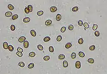 Spore prints are purplish brown to chocolate brown. The smooth, thick-walled spores are broadly ellipsoidal, and typically measure 5.8–7.3 by 3.7–4.4 μm. The basidia (spore-bearing cells) are four-spored, club-shaped, hyaline (translucent, and measure 20–21.3 by 5.8–7.0 μm. Cystidia on the gill edge (cheilocystidia) are sac-shaped to club-shaped, hyaline to pale yellowish brown in color, and have dimensions of 18.3–25.6 by 7.3–11.0 μm; there are no cystidia on the gill face (pleurocystidia).[5]