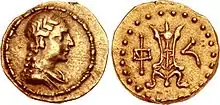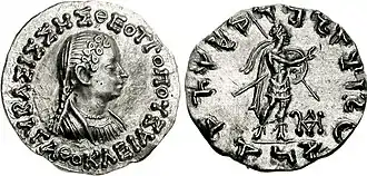 Agathoclea or Agathokleia I Theatropos (Greek: Ἀγαθόκλεια Θεότροπος; the epithet possibly means the Goddess-like) was an Indo-Greek queen married to Menander I, who ruled in parts of northern India in the 2nd-century BC as regent for her son Strato I. Born in Bactria, likely to a noble family (probably royal) with some authors such as Tarn alleging she was a daughter of Eucratides,[1] however this is uncertain and Tarn is often criticised by modern authors for casually creating dynastic relationships. Nonetheless, Agathoclea would become one of the first woman to rule as a sovereign in the Hellenistic world, and she seems to have been relatively significant due to her large presence on the coins of Strato I.