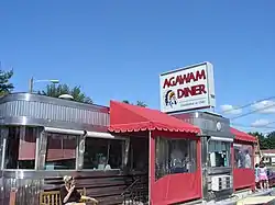The Agawam Diner stands in the area of Rowley known as Kent's Corner, on a lot of 0.75 acres (0.30 ha) at the southwest corner of Newburyport Turnpike and Haverhill Street (Massachusetts Route 133). It is a single-story building, six bays wide and seven deep. Its exterior is finished with a combination of horizontal and vertical metal banding, and has rounded corners. At the center of its main facade is a projecting entry vestibule, with entrances at the sides. The stairs leading to the entrances are sheltered by removable canvas awnings. The interior is divided roughly in half, the front half housing the dining and service area, and the rear the kitchen. The dining area includes booths along the front wall, and stools at the counter separating the dining and service areas.[2]