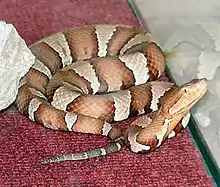 The Trans-Pecos copperhead (Agkistrodon contortrix pictigaster) [3] was once classified as a subspecies of the copperhead (Agkistrodon contortrix). However, DNA based studies published in 2008 and 2015, revealed no significant genetic difference between the Trans-Pecos copperhead (Agkistrodon contortrix pictigaster) and the broad-banded copperhead, (Agkistrodon contortrix laticinctus). The two subspecies were synonymized and elevated to full species, with the oldest published name, Agkistrodon laticinctus, having priority. The resulting taxonomy does not recognizes the Trans-Pecos copperhead (Agkistrodon contortrix pictigaster) as a valid taxon.[4][5] Several subsequent reviews and species accounts have followed and supported the revised taxonomy.[6][7]: 436 p. [8] Information on this snake can be found in the Agkistrodon laticinctus article.