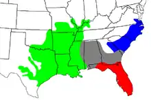 | Geographic variation of A. piscivorus[1] A. p. piscivorus Intergradation | |