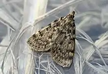 The forewings are greyish brown clouded with a darker hue. They are covered by two indented lines.[3] The dark-hued larvae feed on animal fats,[4] greasy clothing,[3] animal droppings,[1] dead vegetation,[1] fruit and grasses.