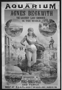 In 1885 she appeared at the Royal Aquarium in Westminster, billed as "The Greatest Lady Swimmer in the World" and her poster boasted of appearing for the Prince and Princess of Wales. Her father had billed himself as the "Greatest Swimmer in the World" in 1851, and her brother was "Baby Beckwith the Wonder of the World" when he was five.[2] See page 324, Rambles of a Physician by Mathew Woods, 1889, online at books.google.co.uk, for a description of Professor Beckwith's Aquatic Entertainments at The London Aquarium; including young ladies swimming to music in a big glass tank ( at one time believed to be the first printed description of synchronised swimming!).
