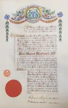 Husband's Burgess ticket was on display in the City Archives for the centenary of women's suffrage,[19] and it says it was "in recognition of the valuable services rendered by her to the Community as a Member of the Parish Council and the Education Authority and in many other ways over a long period of years".