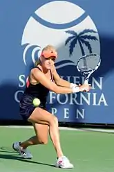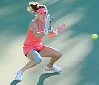 Following the Hopman Cup, Radwańska failed to defend her title at the Sydney International, losing to Bethanie Mattek-Sands in the second round.[47] Radwańska defeated Victoria Azarenka to reach her first Australian Open semifinal, but lost to Dominika Cibulková.[48] Radwańska also reached the semifinal of the Qatar Total Open in Doha, losing to eventual champion Simona Halep. She avenged her loss Halep in the semifinal of the Indian Wells Masters, reaching the final for the first time in her career.[49] Partly due to a knee injury, Radwańska was defeated by Flavia Pennetta.[50] She was in tears while apologizing to the crowd afterward, saying she was unable to run.[51] She then advanced to the quarterfinals in Miami, where she lost in three sets to Dominika Cibulková.[48]