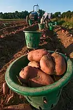When the sweet potato is brought to market it is processed into things like flour, bread, and beverages are made. Northern Ghana has not been able to take full advantage of this food source, in every part of the country, because some of the land is not fertile, and a complex socioeconomic limitation such as many farm owners not being able to come together.[24] This causes a disruption in the market. There is this mistrust among the local farmers because most of the farmers have different opinions on how the product should be marketed. There are five groups of people that help get the Sweet potato to market, the Farmers, traders, commission agents the processors and final the consumers. They all deal with each other in a private and individuals basis.[24] Transportation of the sweet potato is mostly done by outside source such as hired transportation.[25]