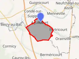 Aguilcourt is 2 km south of the town of Guignicourt. From Guignicourt the commune can be reached by road D62 which runs from the north-west border of the commune through the village and continues to Orainville in the south-east. Highway D622 runs south-west from the village to Cormicy. The western edge of the commune is traversed by the A26 autoroute (E17) but the nearest exit is Exit 14 north of the commune and west of Guignicourt. Some 200m north-east of the town is the Grand Marais railway station just outside the border of the commune. From here trains run north to Guignicourt and south to Loivre.[4]