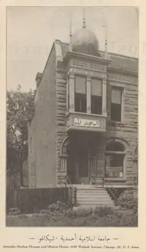 In 1922, Sadiq once again returned to Chicago and re-established the national headquarters of the movement at 4448 Wabash Avenue.[34] A converted house was used to serve as a mosque and a mission house. The mission house was from where the oldest Islamic magazine The Moslem Sunrise was to be published from. Whilst based in Chicago, Sadiq continued to deliver his public lectures on Islam at schools, clubs and lodges across the Midwest. Many a times he was successful in removing misconceptions concerning the religion and occasionally his speeches attracted converts. In 1923, Sadiq gave multiple lectures at the Universal Negro Improvement Association, as a result of which he converted 40 members of the fraternal organization to Islam.[35][36] In September 1923, Sadiq left the United States for India. He was replaced by Muhammad Din, another missionary to the Community. During his three years, Sadiq had converted 700 Americans to Islam.[37] Named in honour of Mufti Muhammad Sadiq, Wabash Avenue is today the site of the Al-Sadiq Mosque, the oldest standing mosque in the United States.