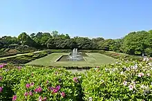 The fountain and flower garden in Aichiken Forest Park in Aichi, Japan