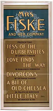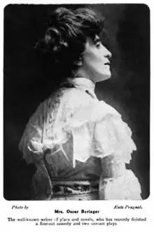 In 1896, To-day magazine described Aimée Daniell Beringer as "one of the most popular personalities in literary and theatrical Bohemia."[3] Beringer was manager of the Opera Comique Theatre in London.[4] Plays by Beringer included Tares: A Social Problem (1888), Katherine Kavenagh, The Prince and the Pauper (1890, adapted from the Mark Twain book), That Girl (1890, adapted from a story by Clementina Black), Holly Tree Inn (1891, 1902; an adaptation of a Charles Dickens story), Bess (1891, 1893), Salve (1895), A Bit of Old Chelsea (1897, 1898, 1902), My Lady's Orchard (1897), The Plot of His Story (1899-1901), Jim Belmont (1901), and The Agitator (1907-1908).[5][6][7] She also wrote novels, including Beloved of the Gods (After the Danish) (1883),[8] A Left-Handed Marriage (1886)[9] and The New Virtue (1896).[10][11]
