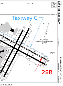 Taxiway C contained four airplanes, three from United Airlines and one from Philippine Airlines, queueing for takeoff.[1] At 11:55:46 p.m. local time, upon spotting aircraft lights approximately 0.7 miles (1.1 km) from the runway, the AC759 pilot asked the tower if he was clear to land on 28R, to which the air traffic controller responded at 11:55:56 p.m., "There's no one on 28R but you,"[1][3][11] when AC759 was approximately 0.3 miles (0.48 km) from the runway threshold.[12] The AC759 pilots "did not recall seeing aircraft on Taxiway C, but something did not look right to them" according to a post-incident interview summary.[7] The crew of Philippine Airlines 115 (PR115) turned on their landing lights to alert AC759 they were lined up on the taxiway.[13][12] The pilot of United Airlines 1 (UA001), the first in line for takeoff, interrupted the radio traffic at 11:56:01 p.m. and asked "Where is this guy going? He's on the taxiway."[1][3] The air traffic controller then ordered AC759 to abort the landing at 11:56:10 p.m. After AC759 acknowledged the go-around, the air traffic controller stated, "It looks like you were lined up for Charlie [Taxiway C] there."[1][3] AC759 had already started to climb before the go-around order.[12]