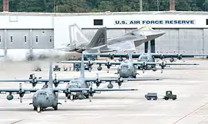 ![]() An F-22A Raptor from the 1st Fighter Wing, Langley AFB, Virginia taking off in front of a C-130H Hercules of the Air Force Reserve 94th Airlift Wing at Dobbins ARB, Georgia. Plant #6 is located at Dobbins ARB | |