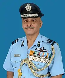 The flag of an Air vice marshal is sky blue with the Indian Air Force roundel surmounted by the eagle from the Indian Air Force badge, with two yellow stars in the fly. The badges of rank consist of one sky blue band (on a slightly wider navy blue band) over a sky blue band on a navy blue broad band. An air vice marshal wears gorget patches which are blue patches with two white stars. In addition to this, the blue grey terrywool tunic has two sleeve stripes consisting of a broad band with one narrow band.[1]