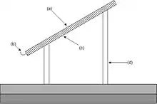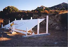 A radiative air well is designed to cool a substrate by radiating heat to the night sky. The substrate has a low mass so that it cannot hold onto heat, and it is thermally isolated from any mass, including the ground.[41] A typical radiative collector presents a condensing surface at an angle of 30° from the horizontal. The condensing surface is backed by a thick layer of insulating material such as polystyrene foam and supported 2–3 metres (7–10 ft) above ground level. Such condensers may be conveniently installed on the ridge roofs of low buildings or supported by a simple frame.[42] Although other heights do not typically work quite so well, it may be less expensive or more convenient to mount a collector near to ground level or on a two-story building.[43]