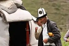 Ak-kalpak takes its name from the Kyrgyz "ak" (white) and the Turkish word "kalpak" (designating any form of hat and passed into Russian as the kolpak in the fifteenth century),[1] the ak-kalpak is an elongated cap formed of four pieces of white wool felt sewn together. It is worn rolled up, so as to form a small rim. Ak-kalpak are usually adorned with black embroidery and a matching lapel; the plain white version is reserved for certain ceremonies. There are more than 80 variants.[2]