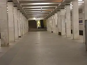 Akademicheskaya (Russian: Академи́ческая, IPA: [ɐkədʲɪˈmʲitɕɪskəjə],English: Academy's) is a station on the Moscow Metro's Kaluzhsko-Rizhskaya Line. It is named for the several Akademichesky Proyezd streets formerly located nearby, which were themselves named after the Russian Academy of Sciences but have all been renamed since. Akademicheskaya opened on October 13, 1962, and was designed by Yuliya Kolesnikova, Petukhova, and Fokina. Built to the relatively new pillar-trispan design (aka Sorokonozhka, centipede), which became prevalent in the 1960s due to its low construction costs. The station has white marble pillars accented with a stripe of black marble near the top. The walls, originally faced with white tile with four horizontal blue stripes, were re-covered in 2003 with similarly coloured aluminium planes for a cleaner, more modern look.