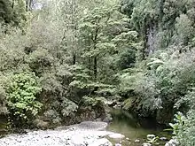 It is a short river, flowing south for 20 kilometres (12 mi) through small rocky gorges and the Akatarawa Valley before joining the Hutt River at Birchville, a suburb in the northern end of Upper Hutt. Its eventual outflow is into Wellington Harbour, then into Cook Strait.