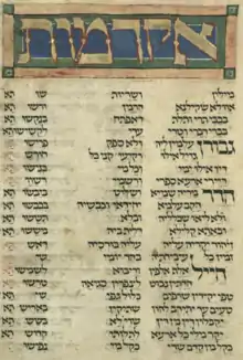 Its adoption into the regular liturgy took some time; it is not mentioned as part of the Shavuot liturgy until the first decade of the 15th century and the earliest prayerbook to contain it was published in 1557.[4] Some say that it replaced an earlier piyyut, Arkin Moshe, which was a folkloric poem describing the excitement among the angels when God brought Moses up to Heaven to receive the Ten Commandments,[5] but both piyyutim appear alongside each other in many manuscripts and printed machzorim.[6] The adoption of Akdamut into the liturgy may have been assisted by a folktale that connected its composition with a miraculous event involving the defeat of an evil sorcerer monk who was using magic to kill countless Jews.[7]
