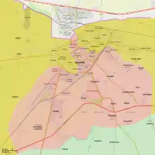 On 19 November, the Islamist rebels launched an assault on the PYD in Ras al-Ayn[48] A rebel sniper also assassinated Abed Khalil, the president of the local PYD council.[49] By the next, SOHR reported that the death toll in the rebel-PYD fighting in the town had reached 34.[50] The opposition activist group Local Coordination Committees of Syria put the number of deaths at 46.[51] Also on 19 November, members of the al-Nusra Front and Ghuraba al-Sham opened fire on a YPG checkpoint, sparking clashes that killed dozens of people. The rebels planned to launch an offensive in Qamishli, but were stopped by the Assyrian Democratic Organization.[52] Meanwhile, pro-government Arab tribes in Qamishli organized themselves into the Popular Committees and clashed with the PYD.[25]