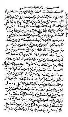 Al-Sahifa al-Sajjadiyya (Arabic: ٱلصَّحِيفَة ٱلسَّجَّادِيَّة, aṣ-Ṣaḥīfah as-Sajjādīyah, [asˤ.sˤa.ħiː.fah as.sad͡ʒ.d͡ʒaː.diː.jah]; lit. 'the scripture of al-Sajjad') is a book of supplications attributed to Ali ibn Husayn, the great-grandson of the Islamic prophet Muhammad and the fourth Shia Imam. A seminal work in early Islamic spirituality, the book is considered to be the oldest prayer manual in Islamic sources.[1] Shia tradition regards the book with great respect, ranking it behind the Quran and Ali's Nahj al-Balagha.[1] Fifty-four supplications form the main body of Al-Sahifa, which often also includes an addenda of fourteen supplications and fifteen munajats (lit. 'whispered prayers'). Al-Sahifa is often regarded as authentic by the specialists in the science of hadith.[2] Chittick describes the book as "one of the deepest veins of Islamic spirituality,"[3] while Jafri posits that the supplications in Al-Sahifa embody the answers to many of the spiritual questions faced by the man of our age.[4]