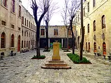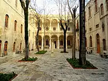 During the 19th century, the Khan was possessed by the Franciscan Missionaries of Mary, where they have founded the first college in Aleppo, the "Collège de Terre-Sainte" (The Holy Land College Arabic: معهد الأرض المقدّسة) along with a nearby church.[1] The rehabilitation works of the building began in 1853 and the college was opened in 1859. However, the construction of the whole complex was completed in 1879. The college has played a significant role in the educational and cultural life of Aleppo and Syria, with the graduation of many prominent politicians and writers within the end of the 19th century and the beginning of the 20th century.