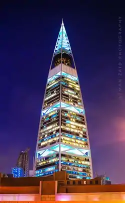 The Al Faisaliyah Centre (or Al Faisaliah Centre, Arabic: برج الفيصلية) is a commercial skyscraper and mixed-use complex located in the business district of Riyadh, Saudi Arabia. The 267-metre-high office tower, the centrepiece of the Foster + Partners development, it is notable for having been the first skyscraper built in Saudi Arabia,[2] and for the monumental stained glass wall of its lobby, designed by architectural artist Brian Clarke in collaboration with Norman Foster.[3] Presently the fourth tallest building in Saudi Arabia after the Kingdom Centre, Burj Rafal and Abraj Al Bait,[4] the Center presently ranks as the 325th tallest building in the world.[5]